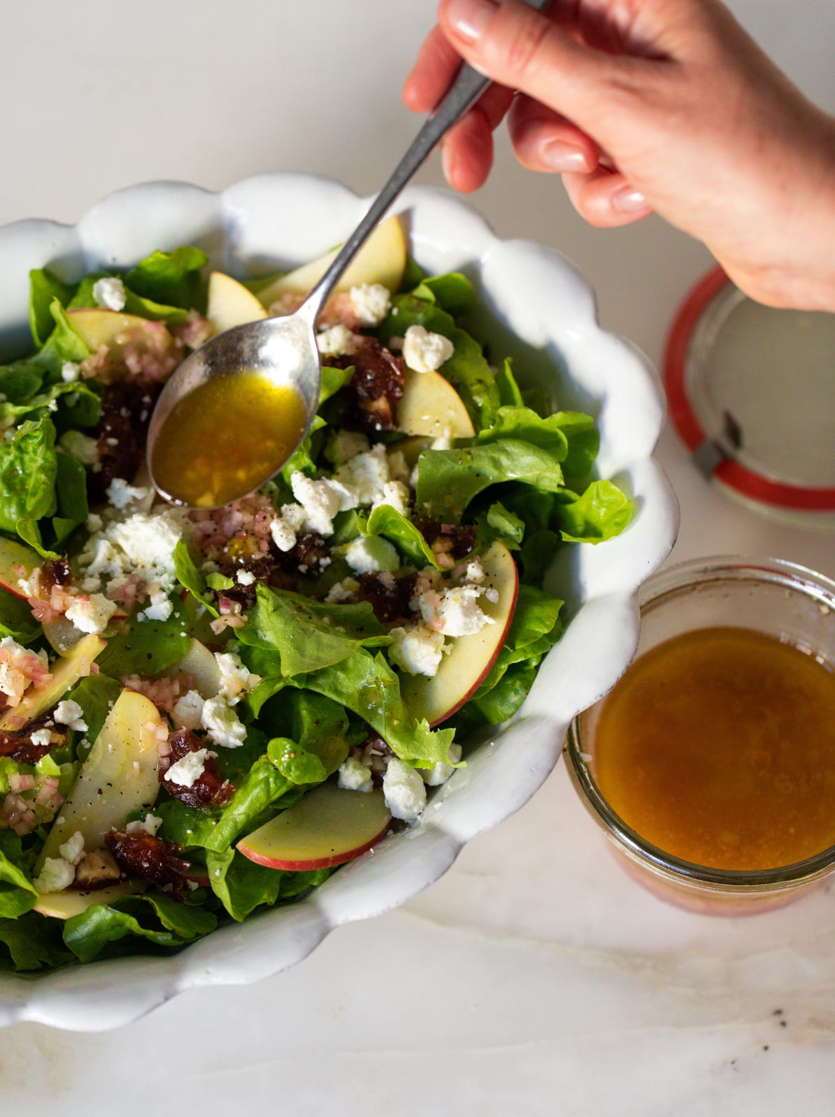 Layer the apple slices, chopped dates, goat cheese, and pepitas over the lettuce.Finish and Serve