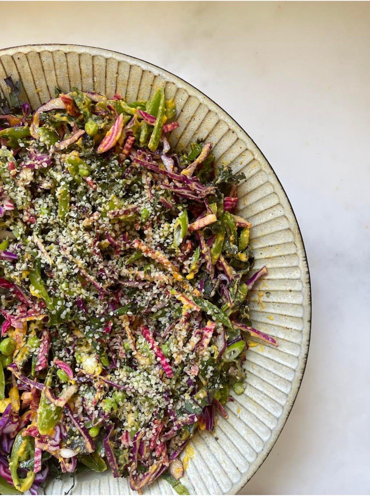 Use a mandoline (or sharp knife) to slice the cabbage, snap peas, carrots, and radishes super thin. Remove stems from the kale and chop the leaves finely. Combine everything in a large bowl.Make the Dressing