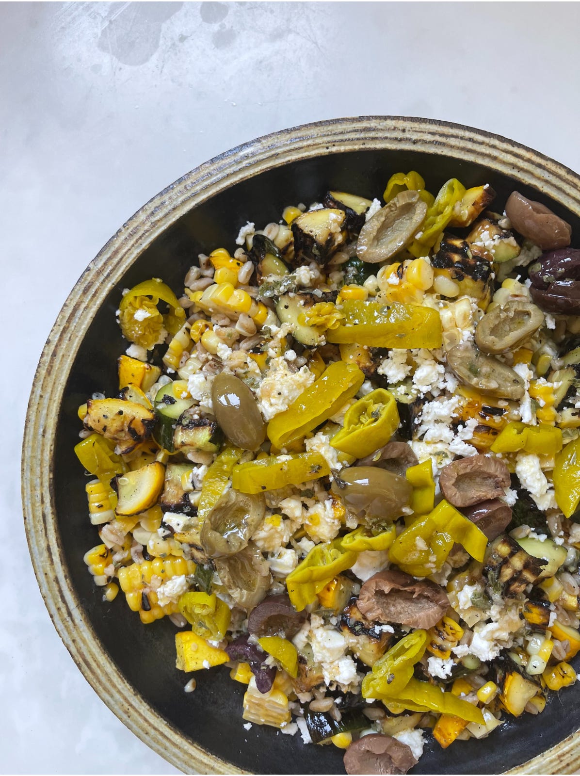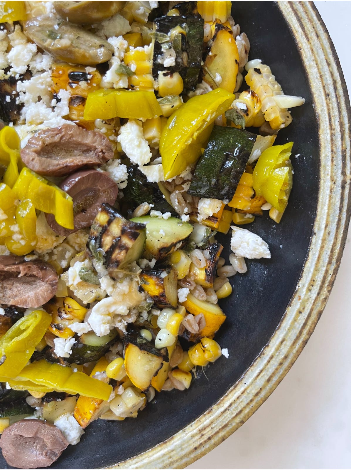 A hearty, char-grilled grain salad with Mediterranean vibes — perfect for late summer picnics or easy lunches.