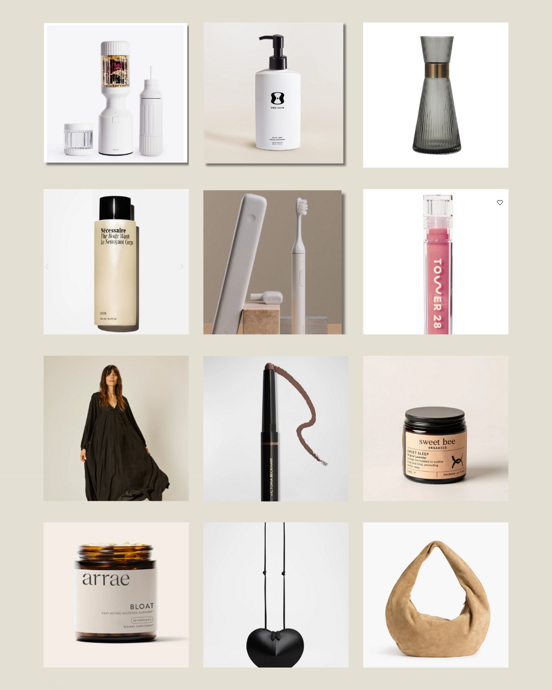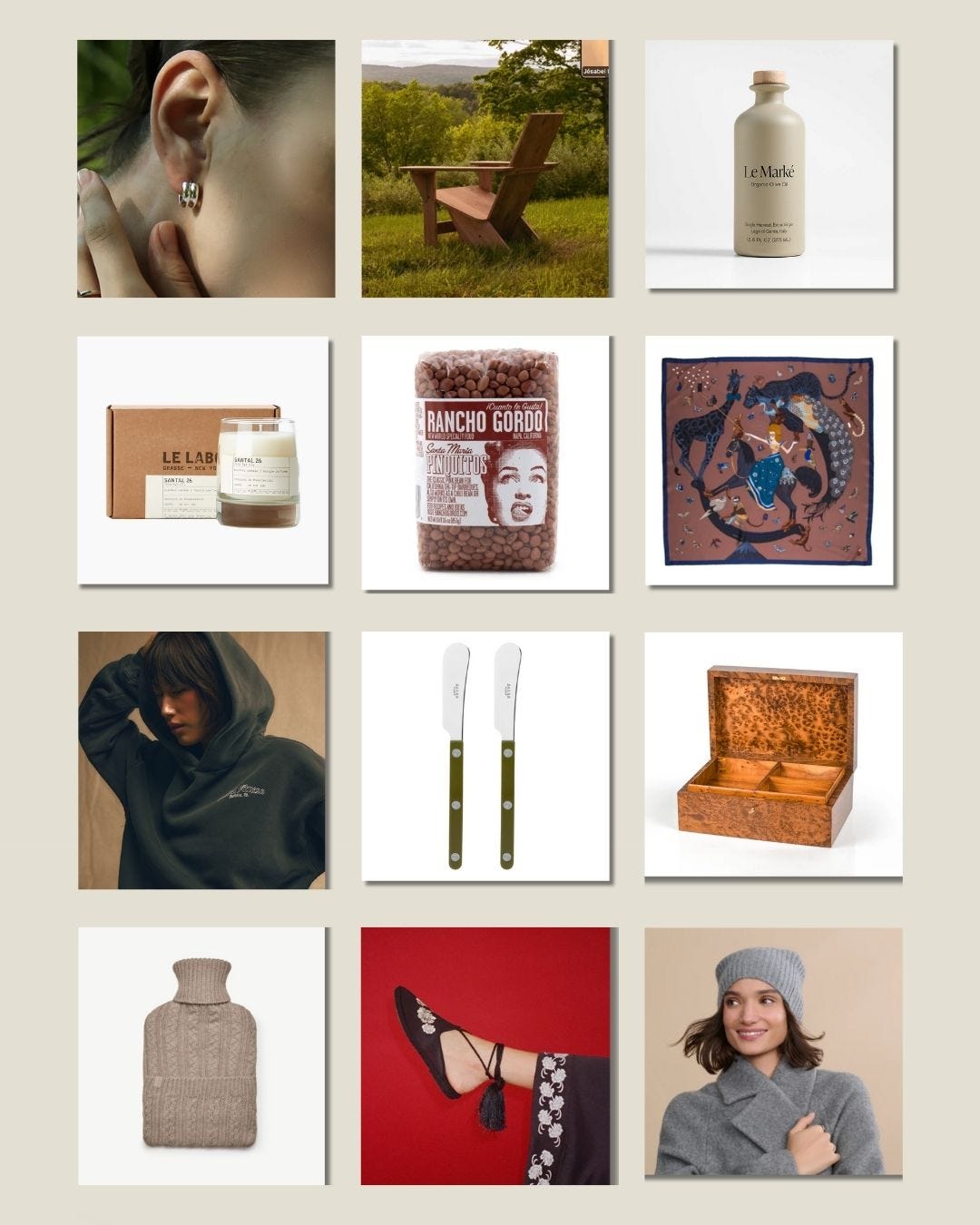 Fashion + BeautyHoliday Gift Guide – Part 1Leanne CitroneNov 20, 20254ShareAlmina Concept – Line EarringRoseland USA – Westport ChairLE MARKÉ – Organic Olive OilLE LABO – Encens 9 Classic CandleRANCHO GORDO – Pinquito Santa Maria BeansHermès – Head ScarvesGlobal Fitness Studio – Dark HoodieSabre Paris – Butter KnivesJewelry BoxGlow Hot Water Bottle CoverViani Milano X Ciao Lucia – Embroidered Satin SlideJenni Kayne – Cashmere BeanieBeast Health - Blender TonalOneSkin - OS-01 BODY Topical SupplementRosendahl - CarafeNECESSAIRE - The Body WashSuri - ToothbrushTOWER 28 - Shine On Lip JellyNatalie Martin - Fiore Maxi DressVictoria Beckham - Eyewear Eyeshadow StickSweet Bee Organics - Sweet Sleep Magnesium ButterArrae - Bloat XLAlaia - Le Coeur Crossbody BagFlattered - Alva Sholder Bag