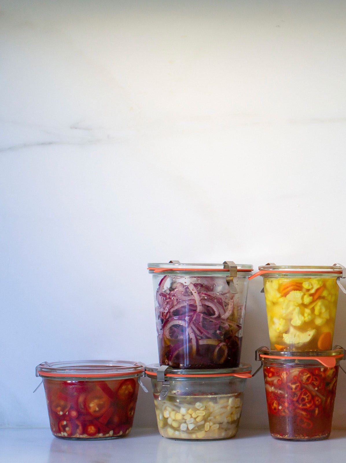 Red onions, carrots, cauliflower, and corn are great starting points — but almost any vegetable works. Use a mandoline for thin slices (great for onions), cut cauliflower into small florets, or slice carrots into bite-sized rounds. Place the prepped vegetables into clean glass jars.Select Your Vinegar