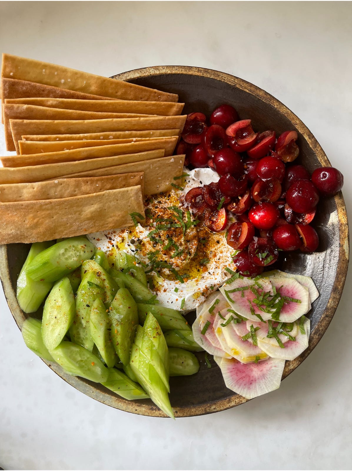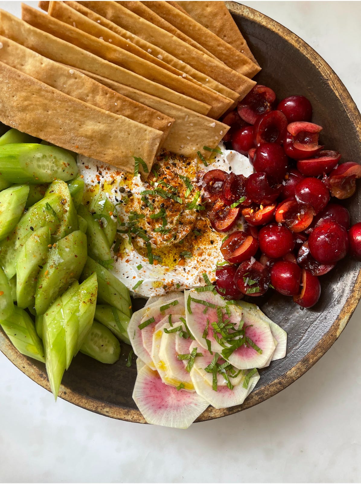 A beautiful, summery platter built around creamy labneh—perfect for scooping with crisp vegetables and crackers.