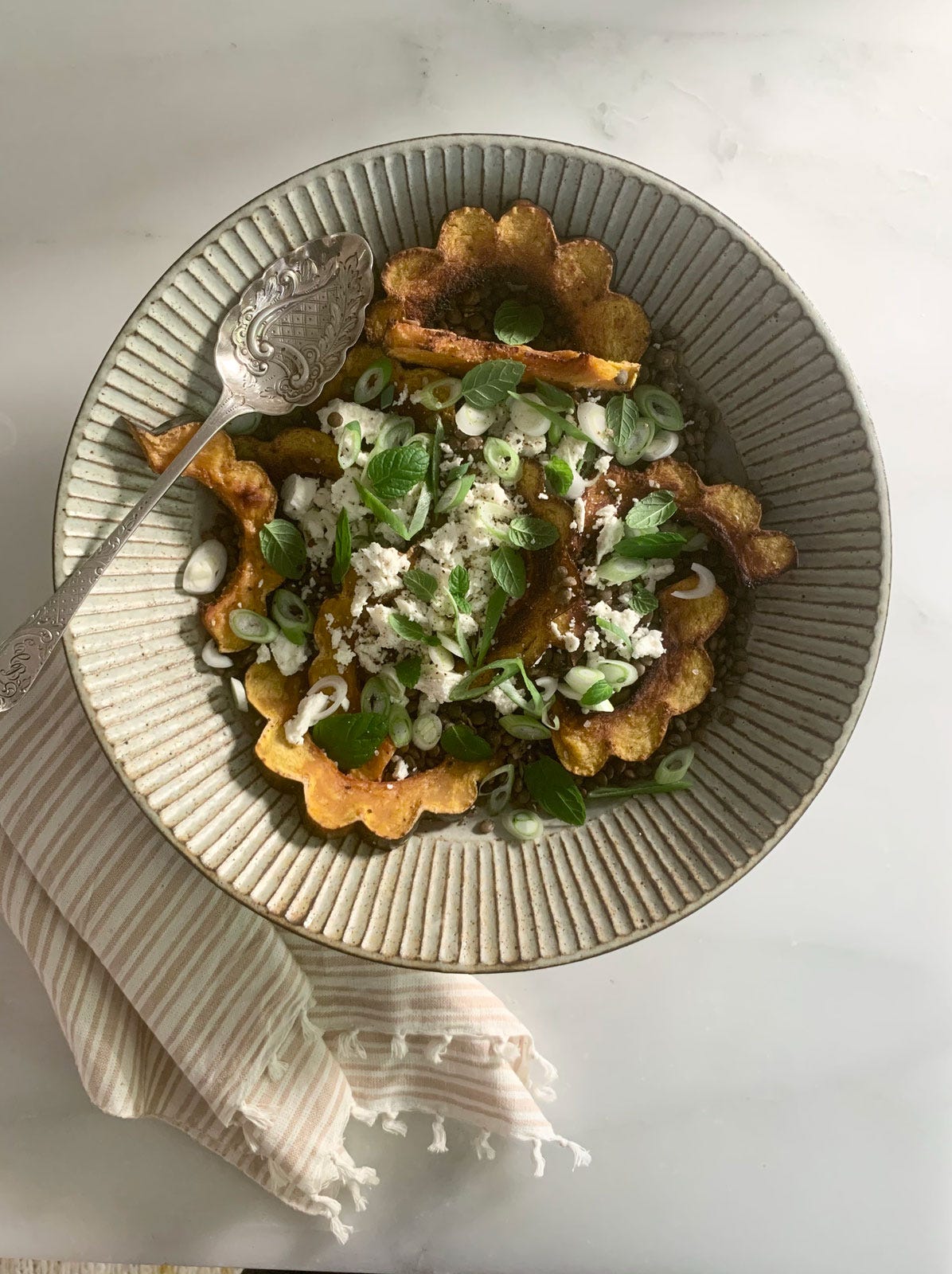 Earthy lentils, caramelized squash, and sharp feta — a grounded dish with fresh, bright edges.