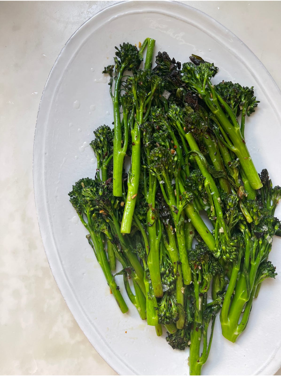 Heat a wide-bottomed pan over medium-high heat. (A cast iron pan works beautifully for this dish.)Sear the Broccolini