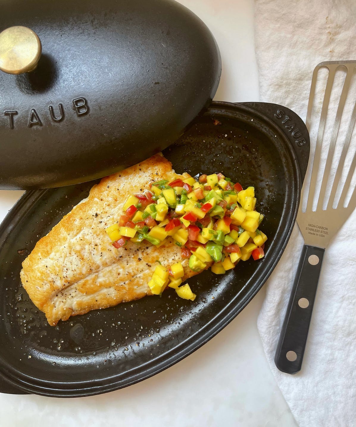 Heat a Staub fish dish or cast-iron skillet over high heat. Add the remaining 1 tablespoon of olive oil. Once hot, carefully place the fish in the pan. Season with salt and pepper and sear without moving it for about 5 minutes, or until a golden crust forms.Finish Cooking