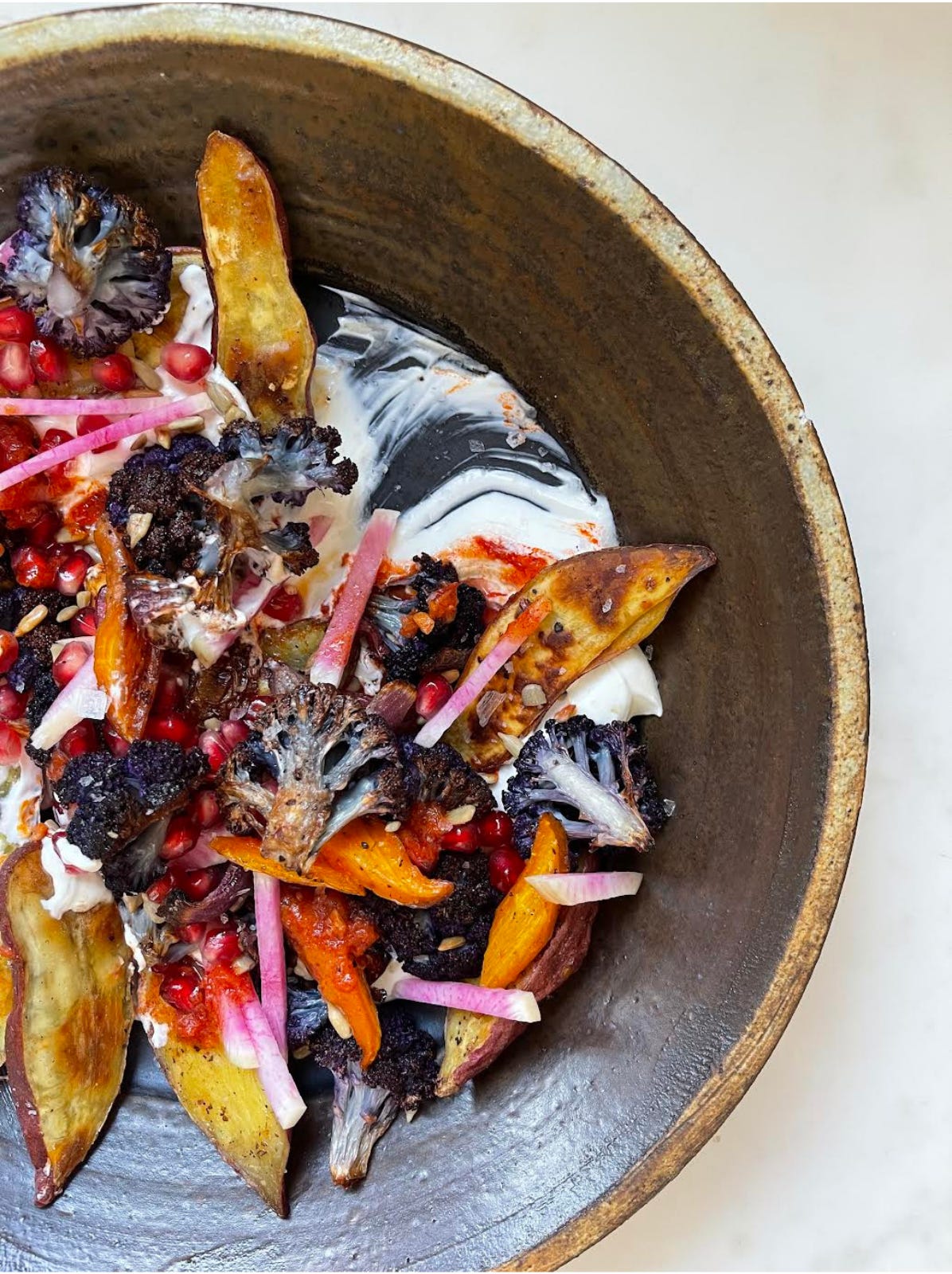 Layer the roasted vegetables over the labneh. Scatter the watermelon radish, sunflower seeds, and pomegranate seeds on top. Finish with a final drizzle of harissa, a sprinkle of Maldon salt, and serve with flatbread if desired.