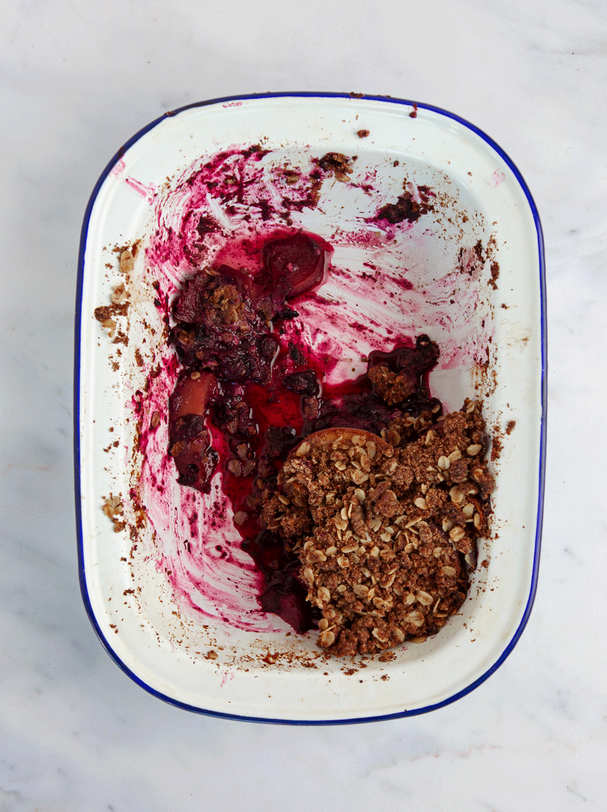 Place the dish on a baking sheet to catch any overflow. Bake for 45 minutes, or until the topping is golden and the fruit juices are bubbling around the edges.Serve