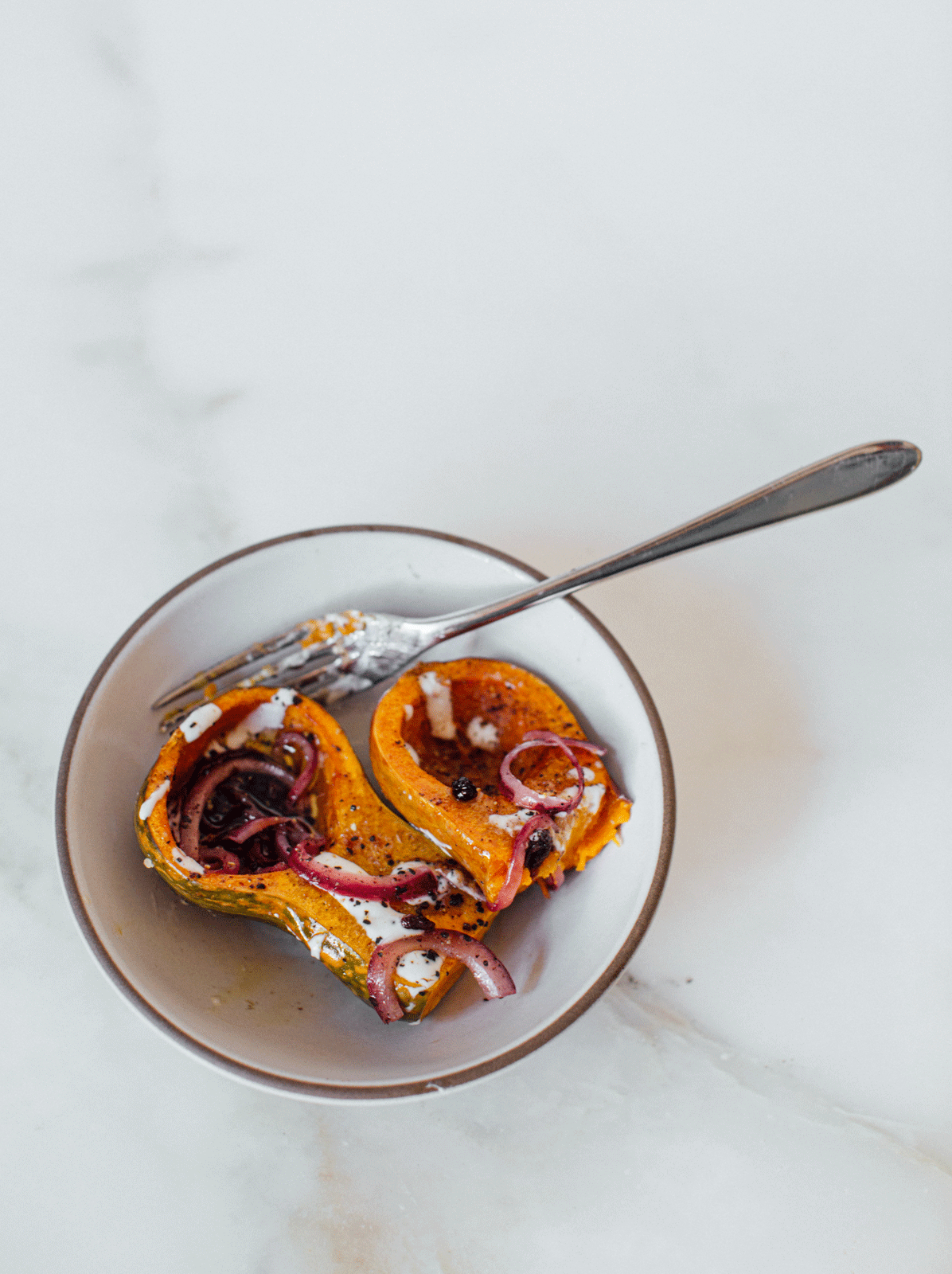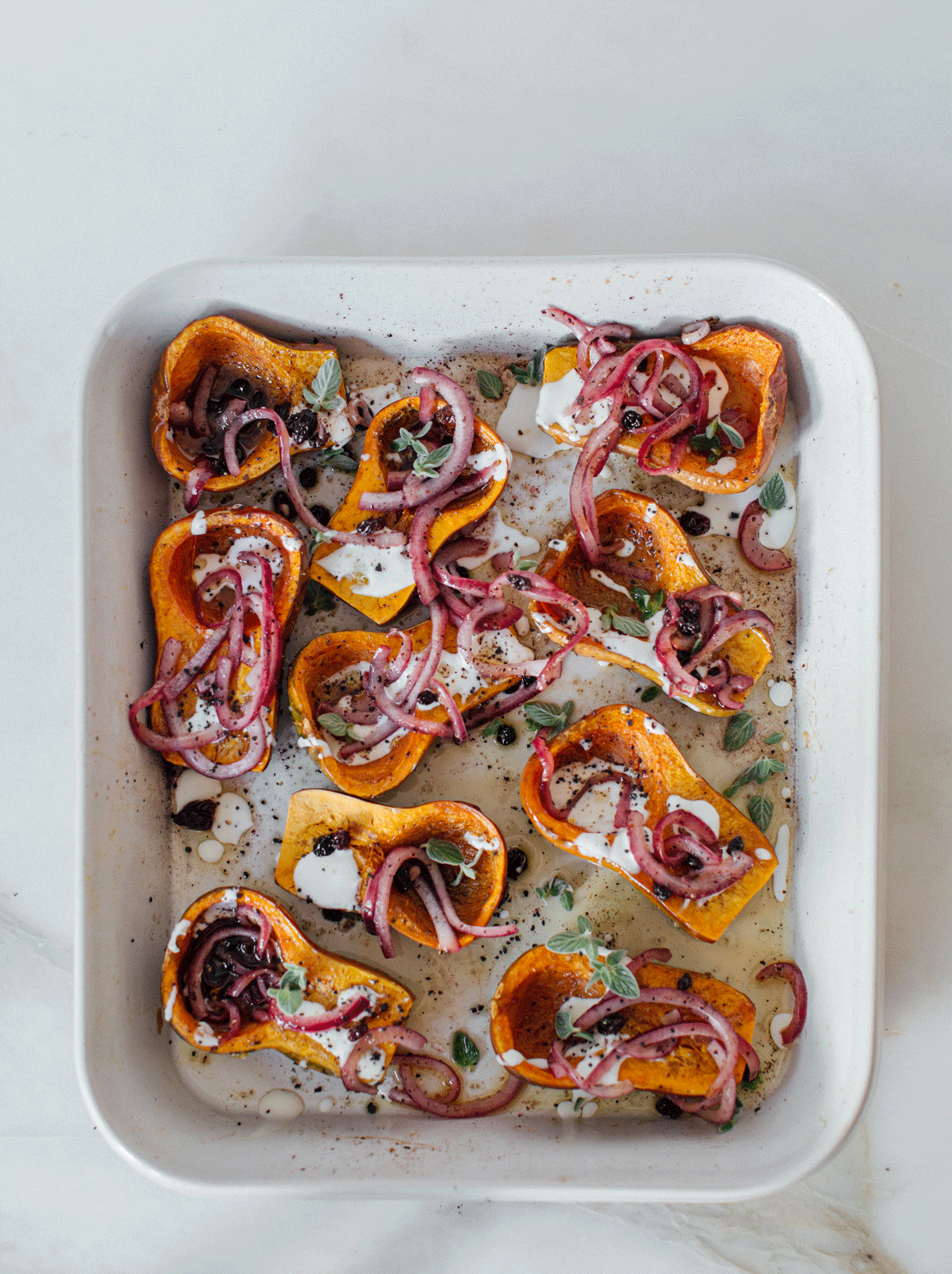 Drizzle the squash with olive oil, season with salt and pepper, and arrange in a roasting dish. Roast for 30–40 minutes until golden and tender.Make the Onion with Sumac Dressing