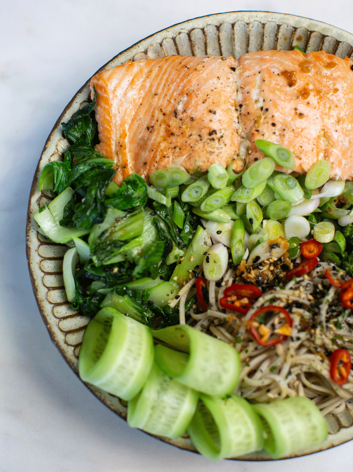 Divide the soba noodles between four bowls. Drizzle each portion with the remaining Tamari Yuzu sauce. Top with roasted salmon, sautéed bok choy, and broccolini. Add the cucumber ribbons, scallions, and sliced Fresno chili. Finish with sesame seeds (or gomasio) and a squeeze of lime.