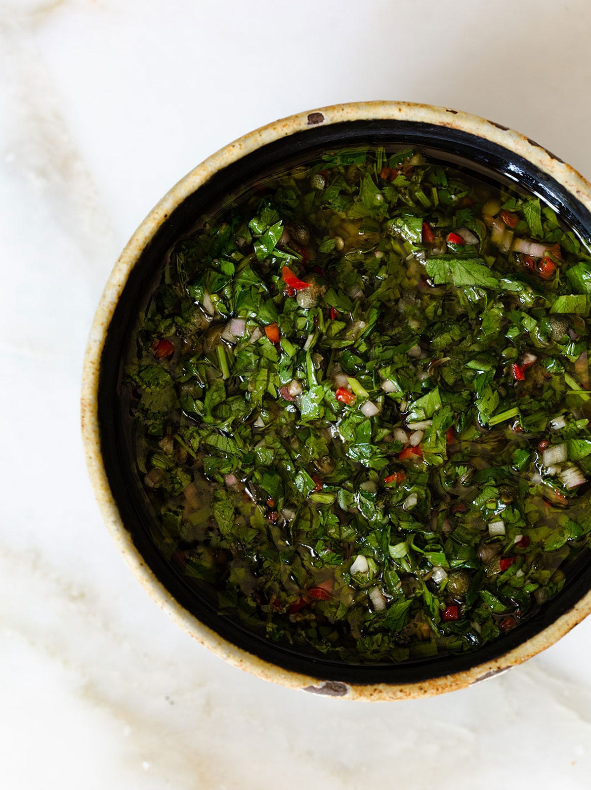 A vibrant, herb-packed condiment with just the right amount of heat and acidity — perfect for grilled vegetables, fish, or anything that needs a bright, zippy finish.