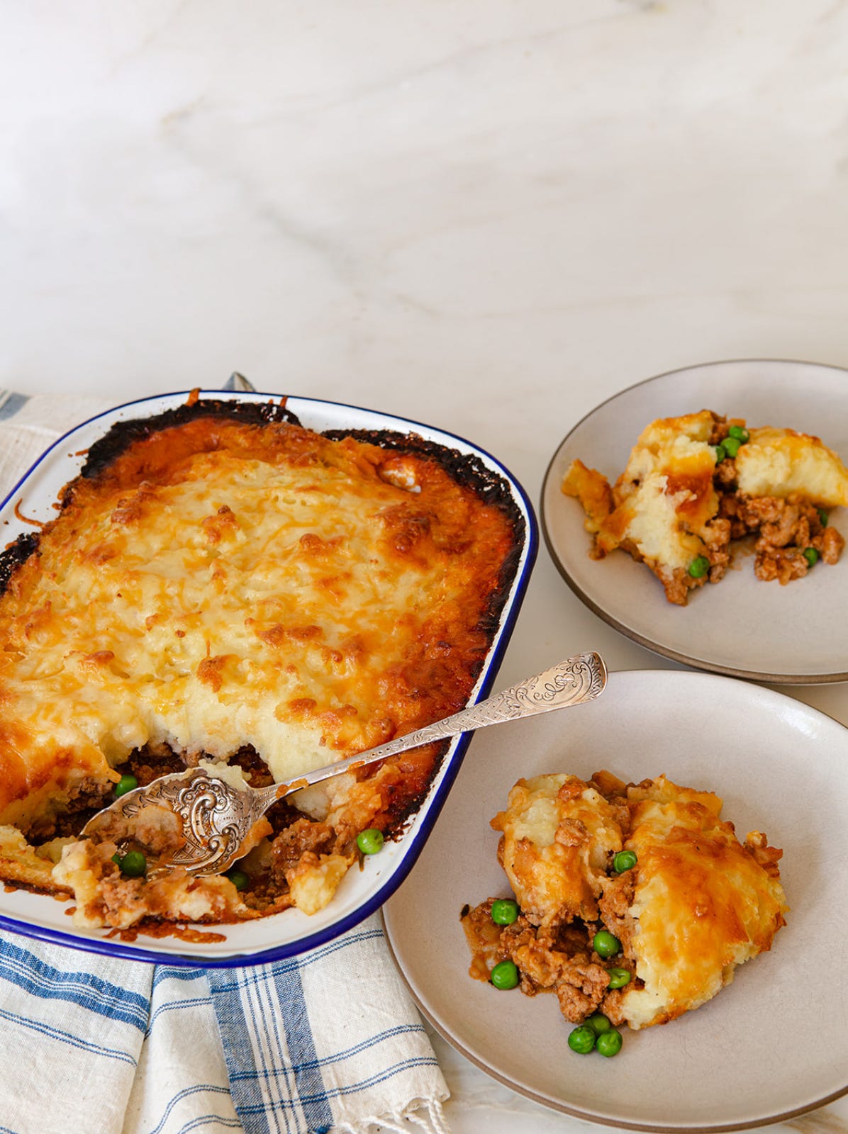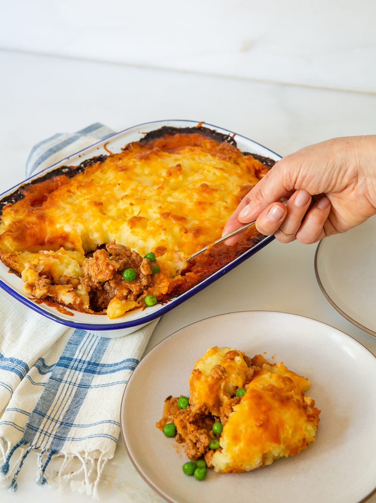 Spread the mashed potatoes over the filling in an even layer. Use a fork to gently press and texture the top. Sprinkle generously with shredded cheese. Bake for 30 minutes, until the top is golden and the edges are bubbling.Serve