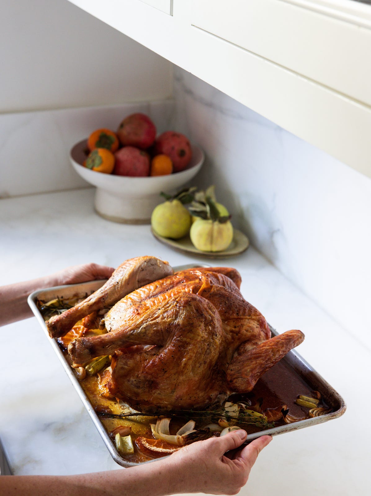 Rinse the turkey under cold water and scrub with kosher salt to clean. Rinse again and pat completely dry. Place on a baking sheet and season generously with salt. Leave uncovered in the fridge until Thanksgiving Day.Bring to Room Temperature