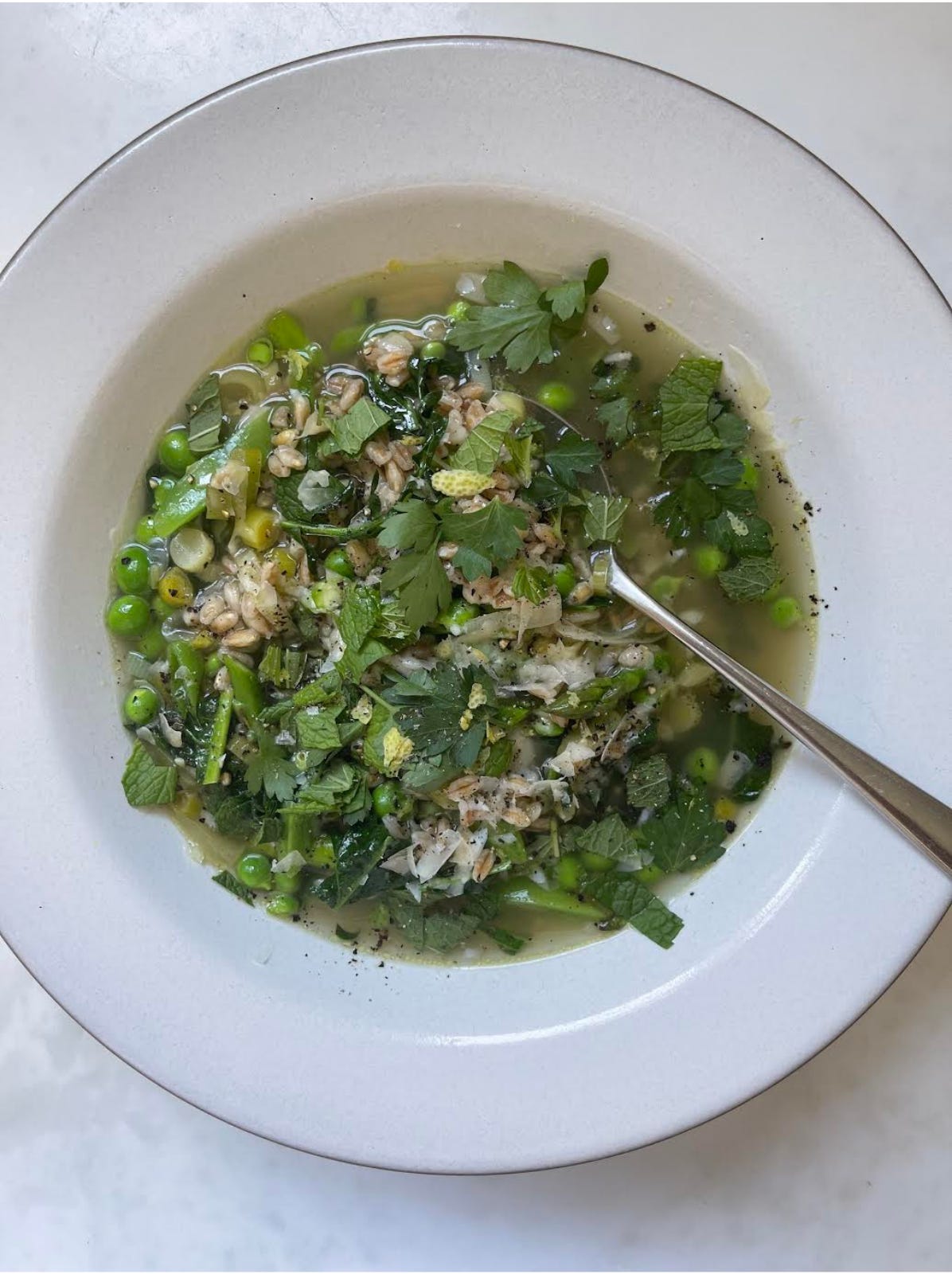 A bright, brothy bowl full of spring vegetables and chewy farro, finished with herbs, lemon zest, and plenty of Parmesan.