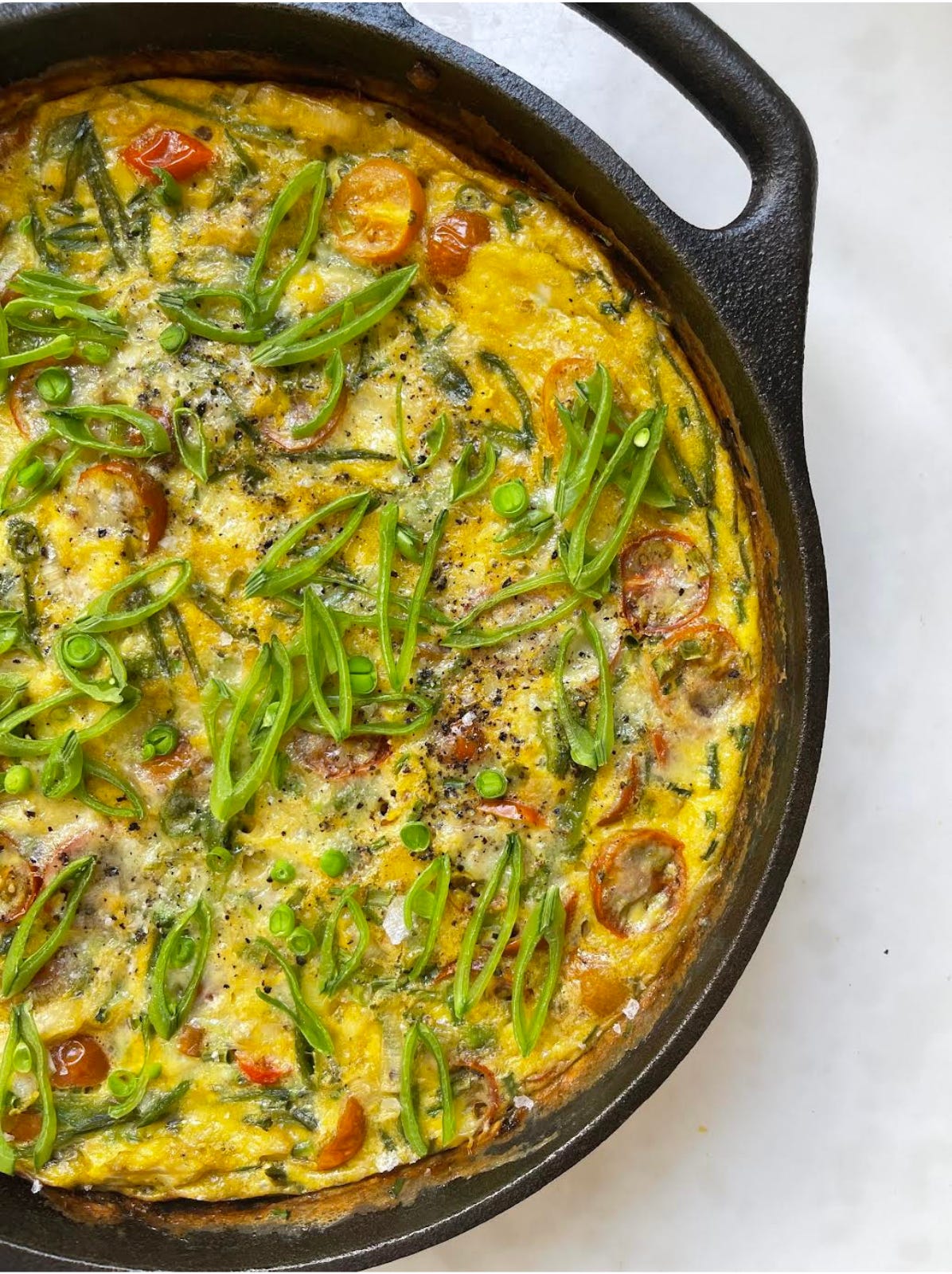 A fresh, vibrant frittata that celebrates the best of spring — sweet peas, juicy tomatoes, and tender leeks all folded into pillowy eggs.