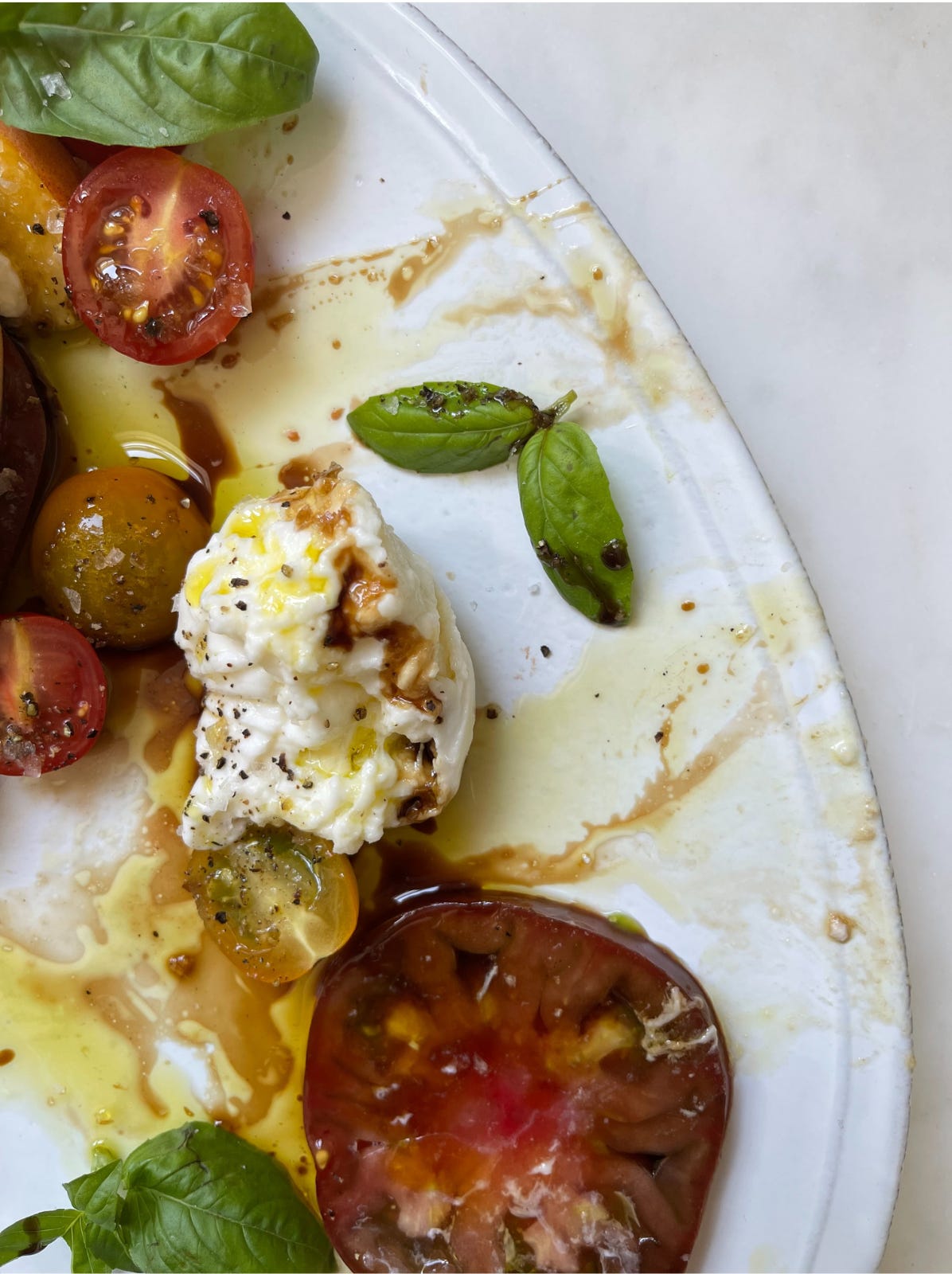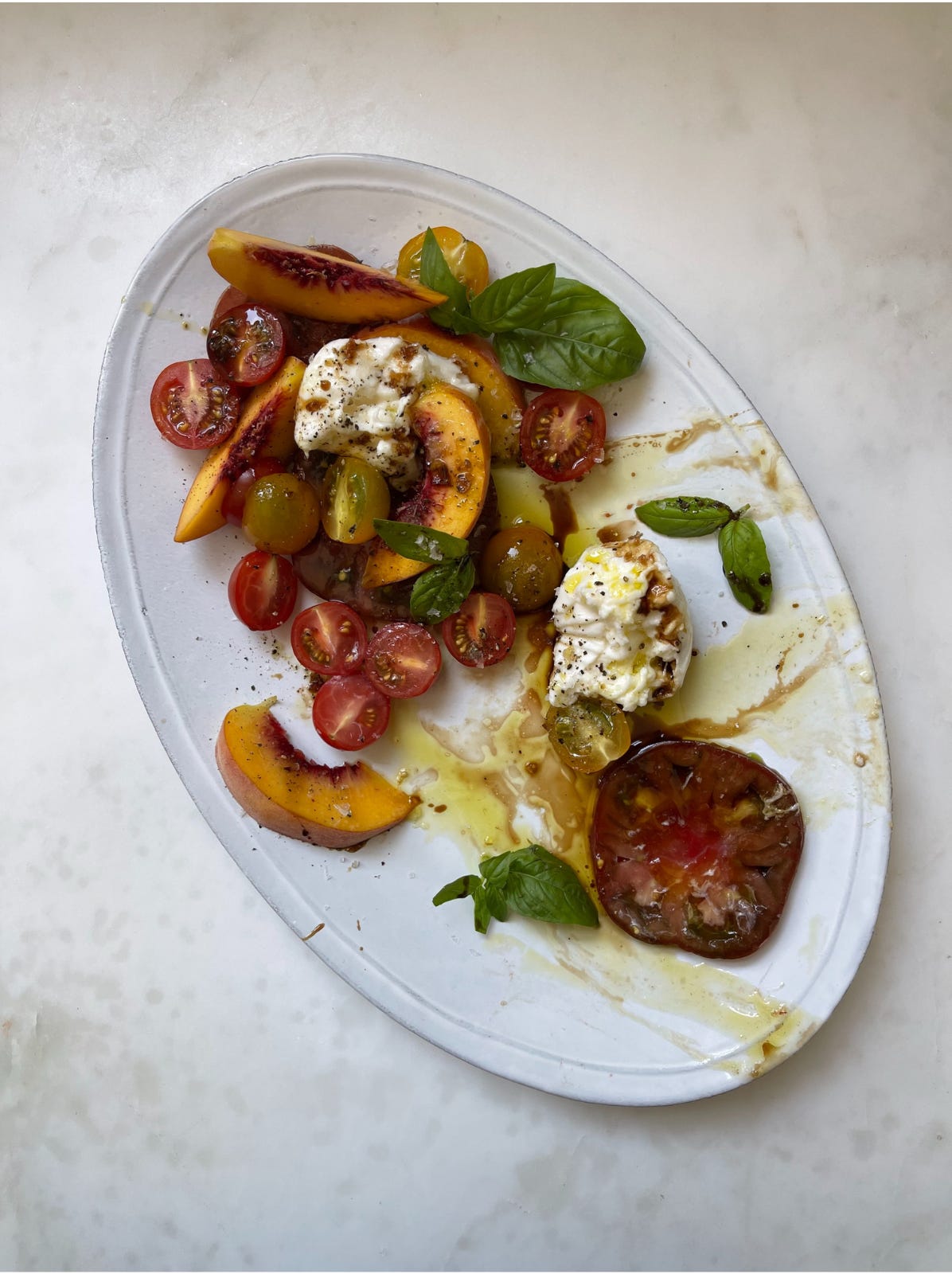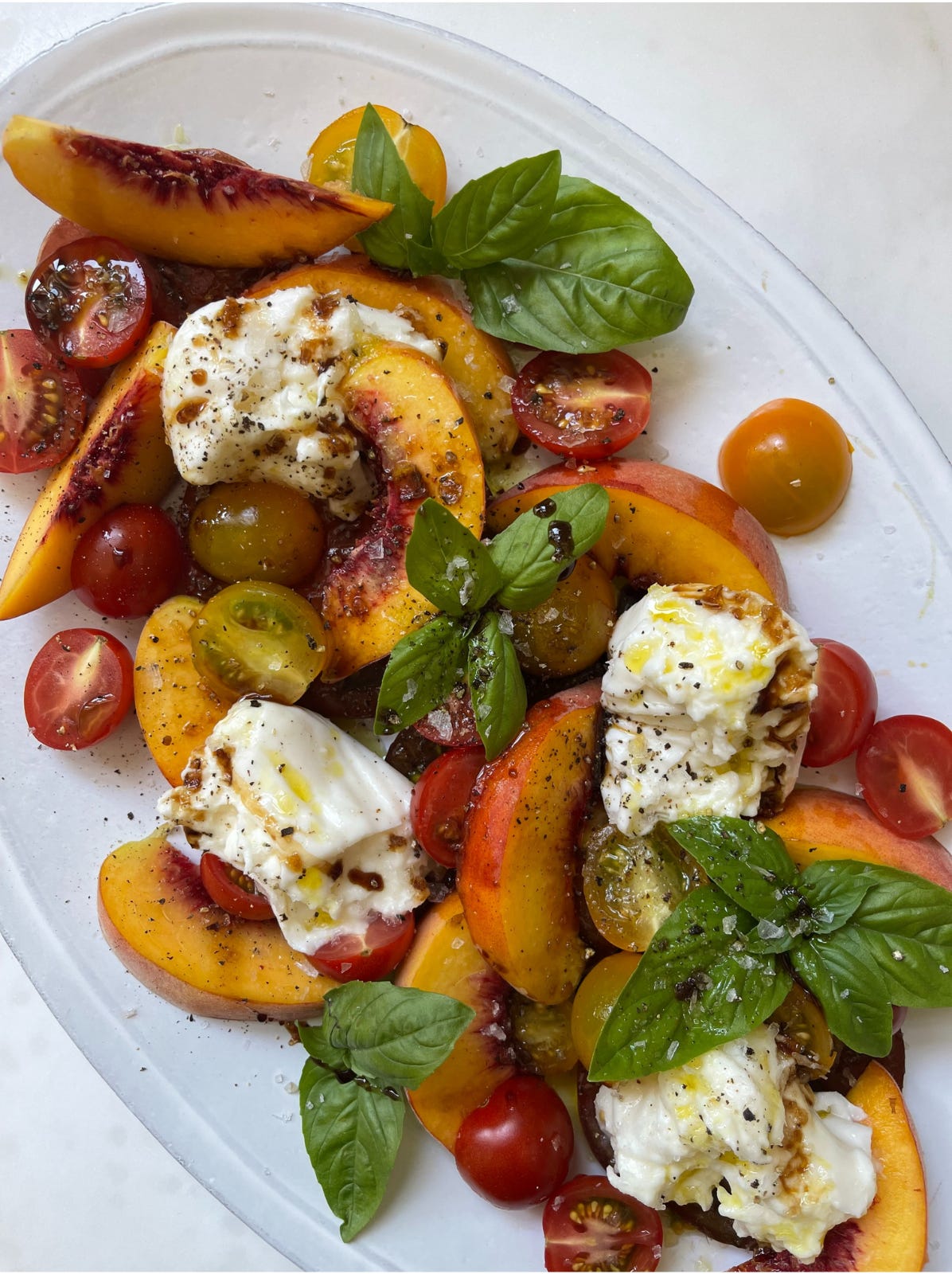 Peak summer in a dish—juicy tomatoes, ripe peaches, and creamy burrata finished with basil and a drizzle of balsamic.