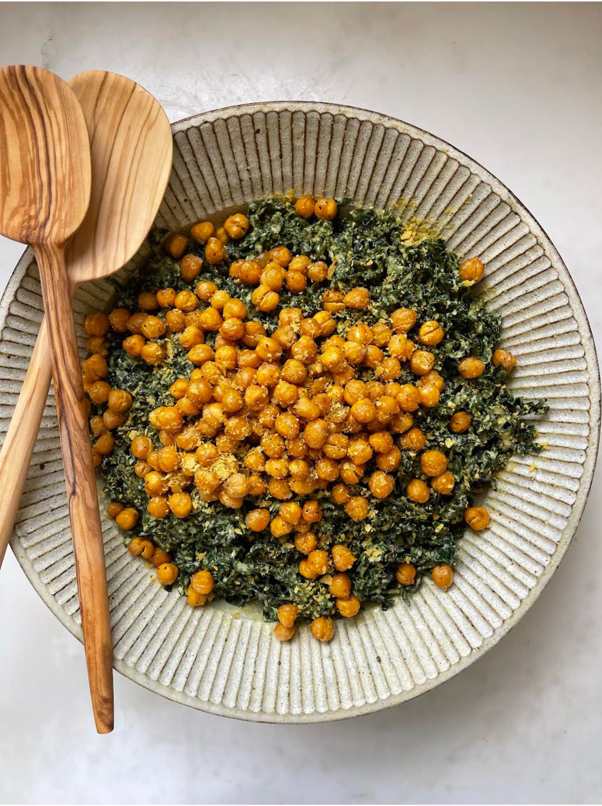 Scatter roasted chickpeas over the salad and finish with a sprinkle of nutritional yeast. Serve immediately.