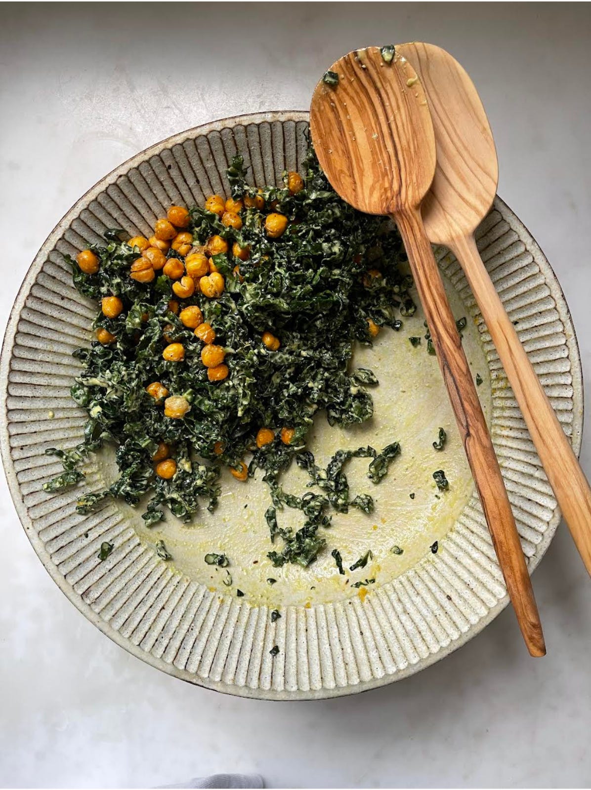 If your kale is soft or wilted, rehydrate it: strip leaves from stems and soak in cold water in the fridge for 1–2 hours. Rinse and dry thoroughly. Stack several leaves at a time, slice into thin ribbons, and place in a serving bowl.Dress and Toss