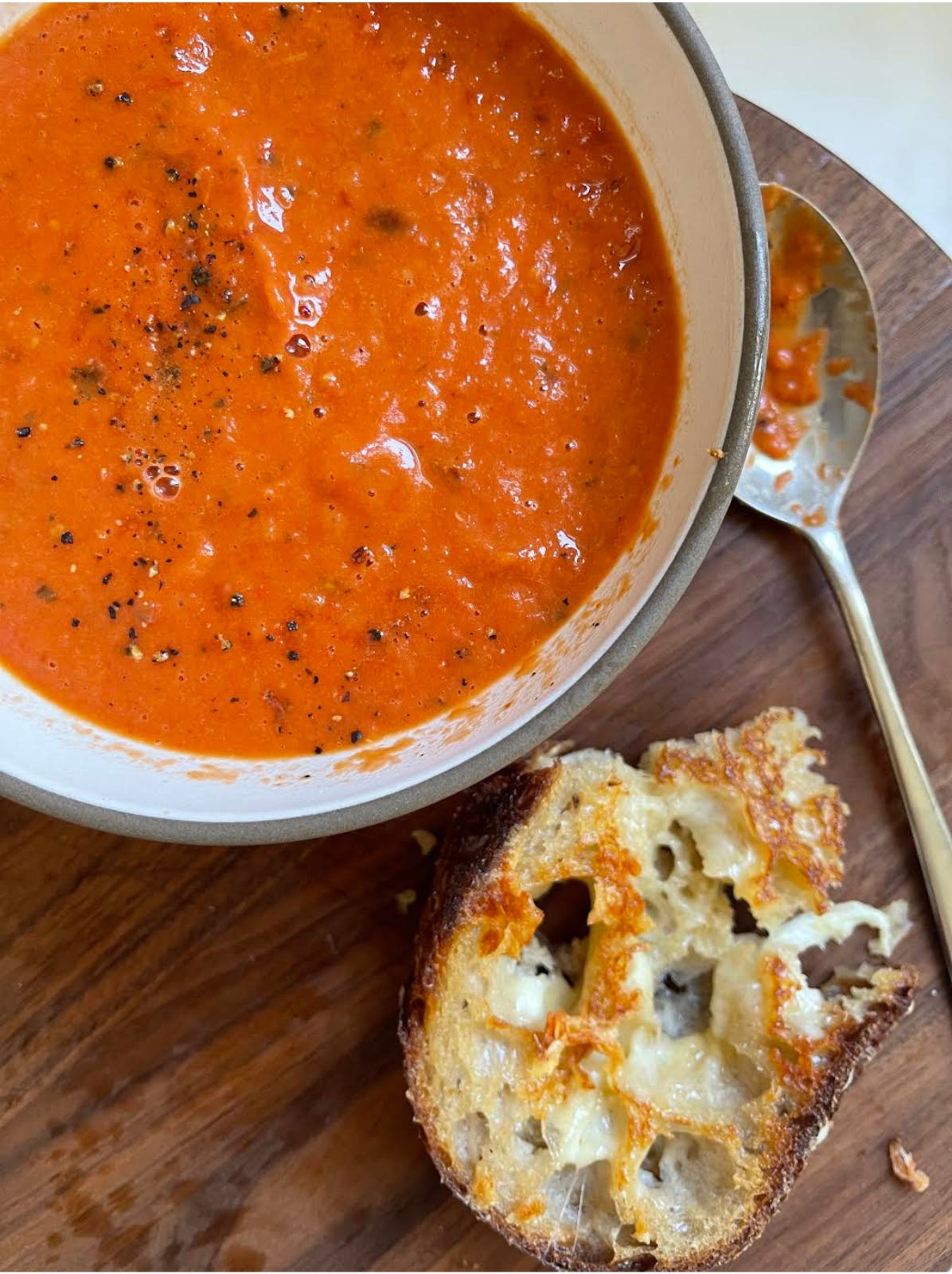 Season to taste with salt and cracked pepper. Serve warm — ideally with a grilled cheese sandwich.