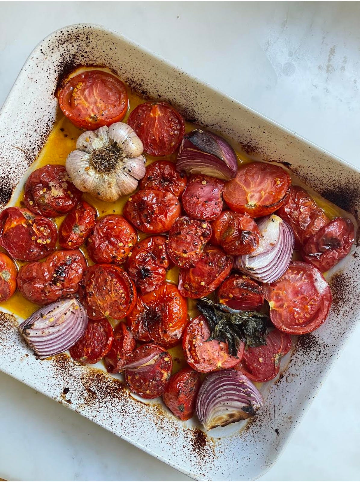 Preheat the oven to 400°F. In a heatproof baking dish, arrange the tomatoes, onion, garlic head, and basil. Drizzle generously with olive oil and season with chili flakes, salt, and pepper. Roast for 30–40 minutes, until the tomatoes are soft and caramelized.Prepare the Garlic